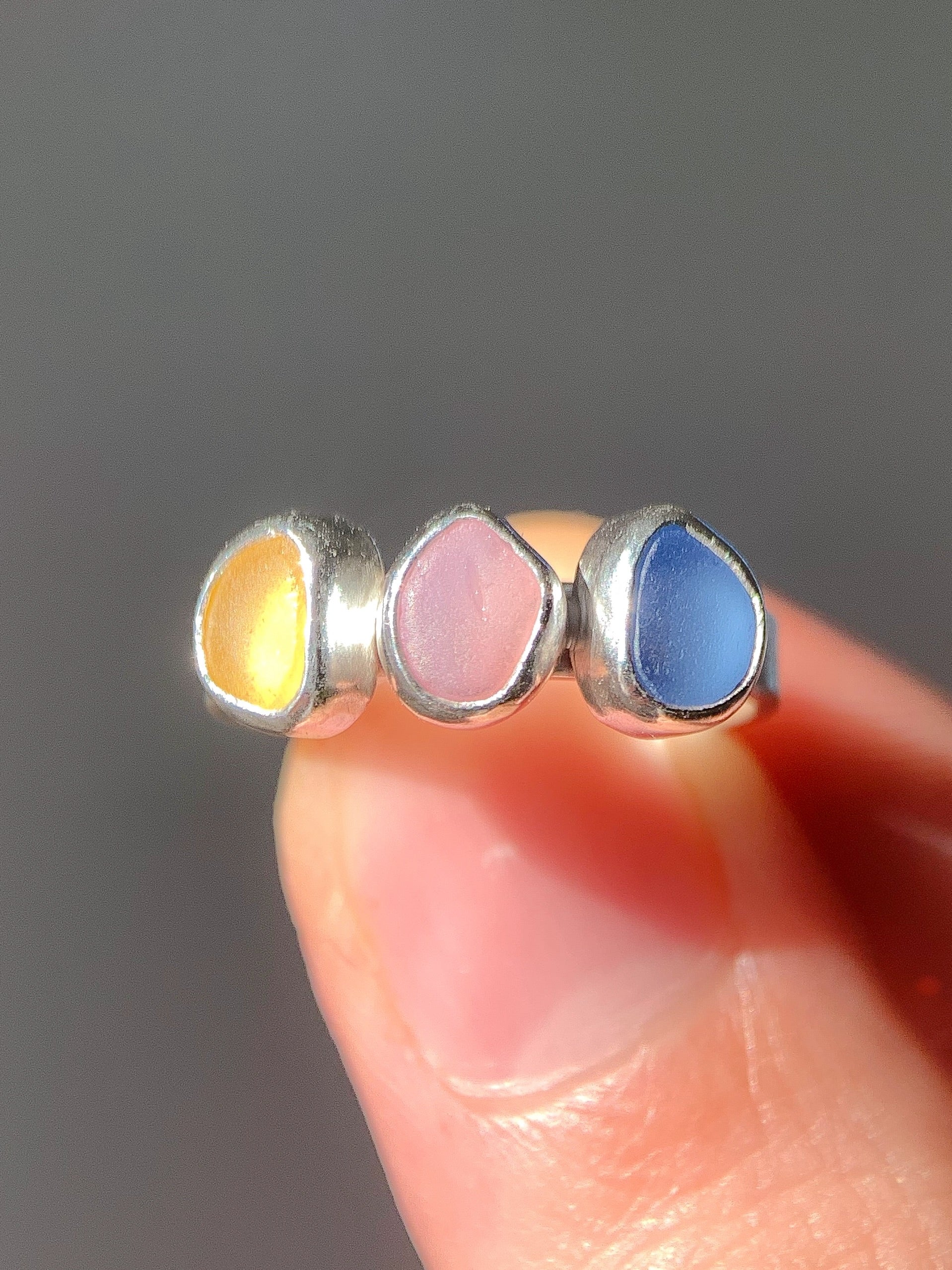There 3 pieces of sea glass are each set in a handcrafted fine silver bezel with a sterling silver backplate to allow the true color to reflect & on a sterling silver rectangular wire band.