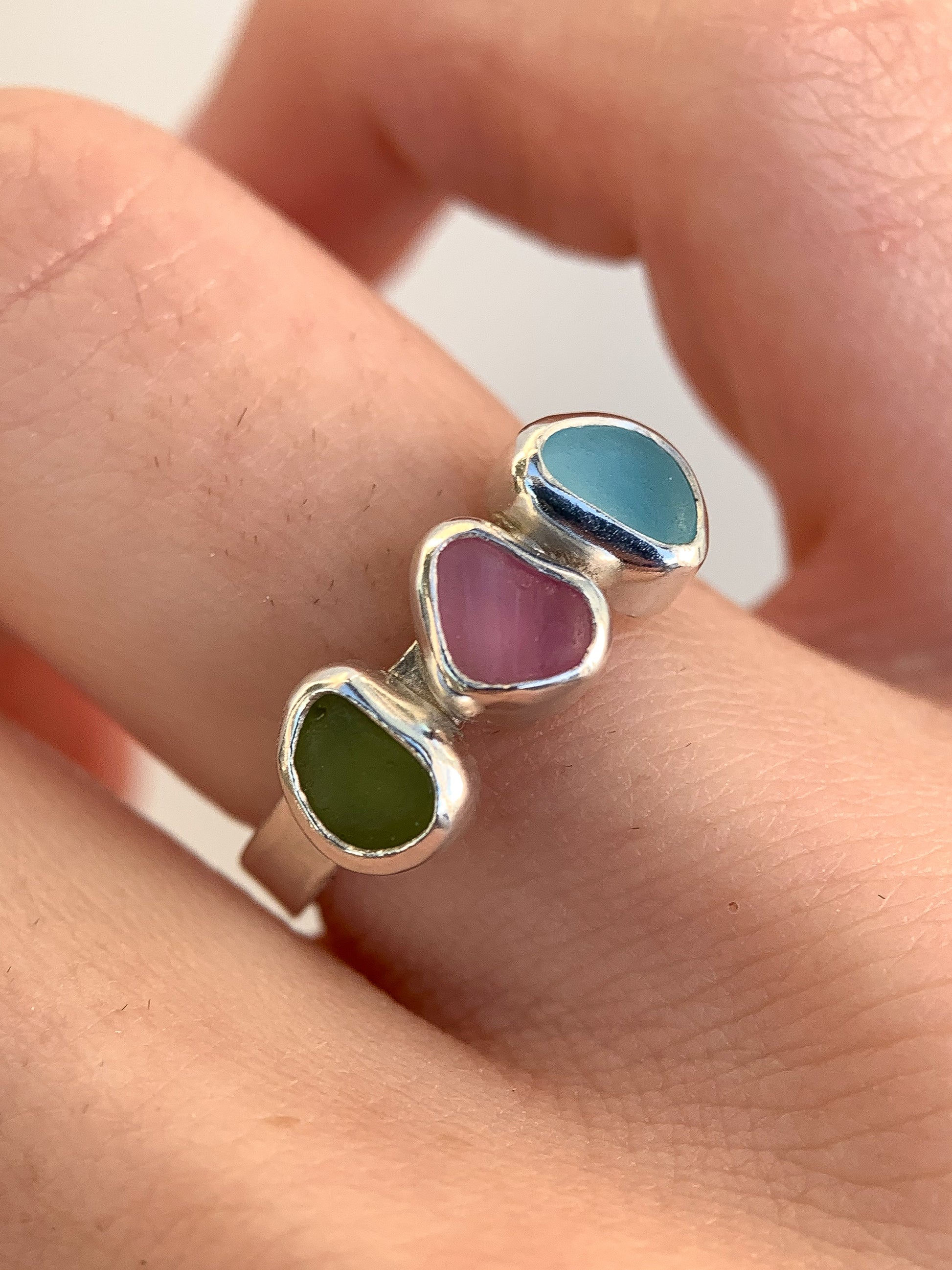 There 3 pieces of sea glass are each set in a handcrafted fine silver bezel with a sterling silver backplate to allow the true color to reflect & on a sterling silver rectangular wire band.