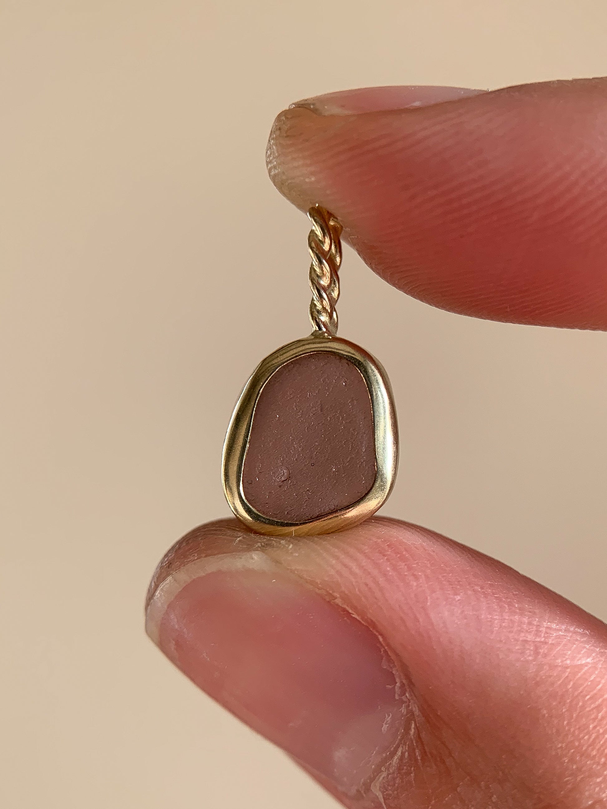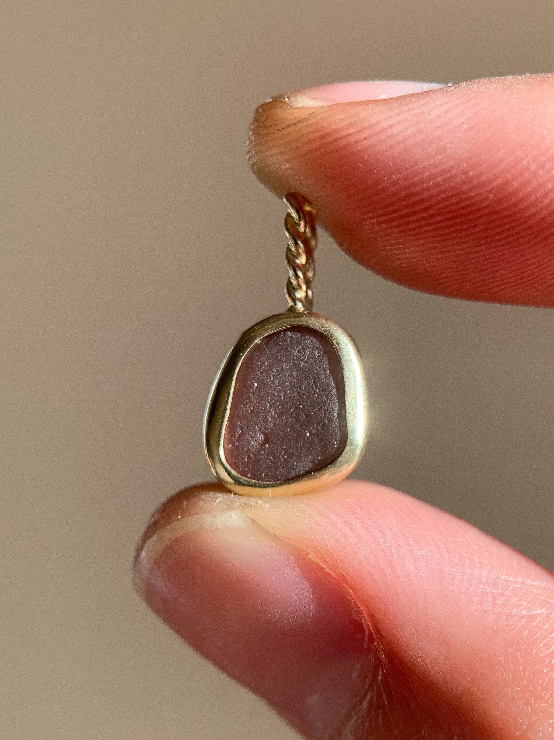 This piece of sea glass is set in a solid 10k gold bezel with an open back to display either of it’s unique sides.