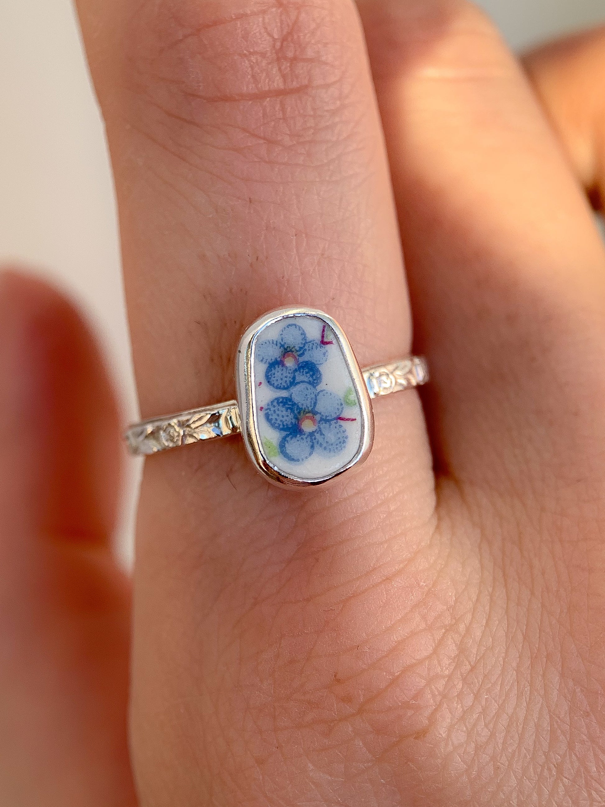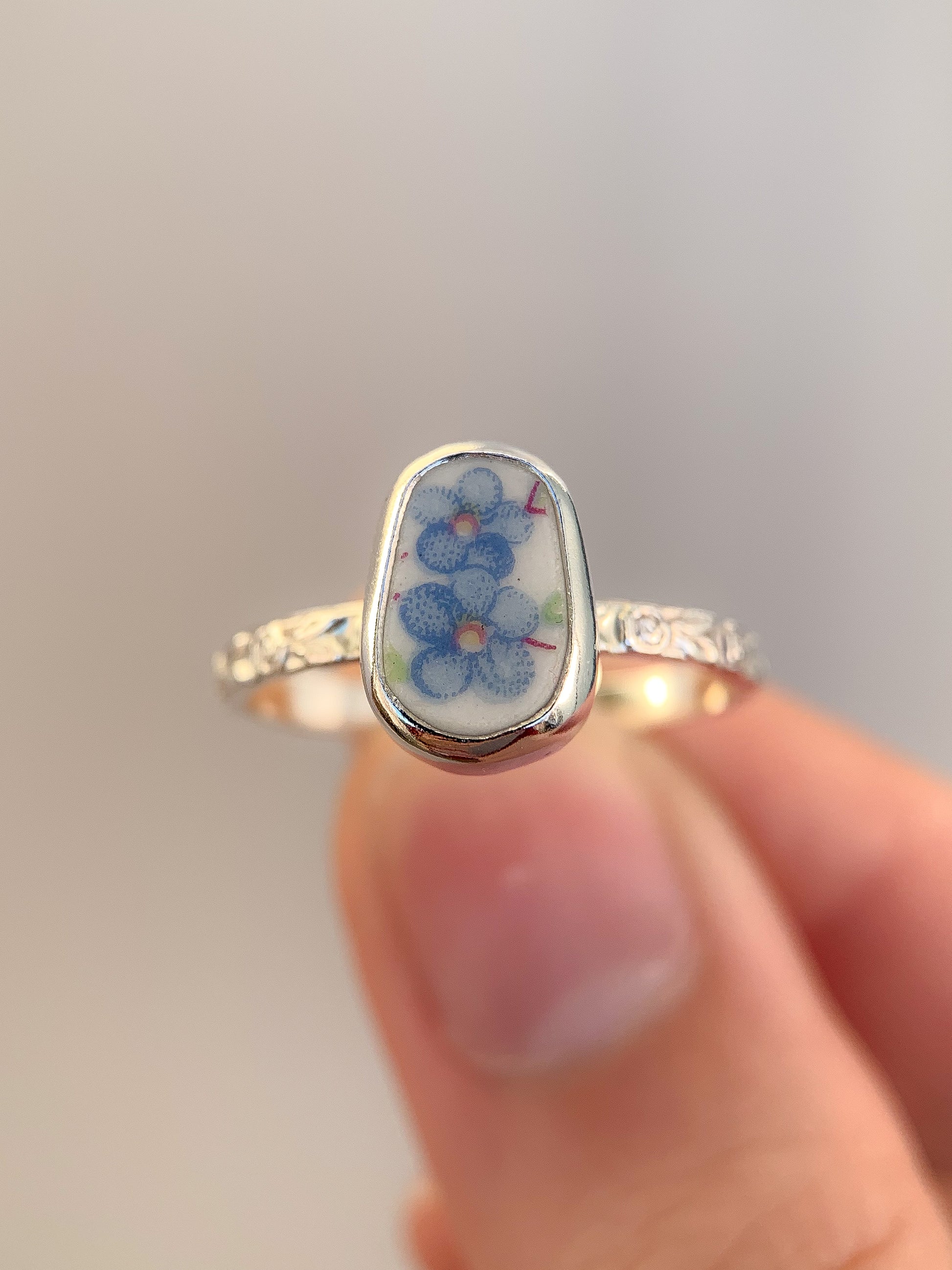 Using broken pieces of gifted & thrifted pottery, china, and ceramics, I shape each piece to a more soft and organic shape & set in a fine silver bezel on a simple sterling silver rose-patterned band.