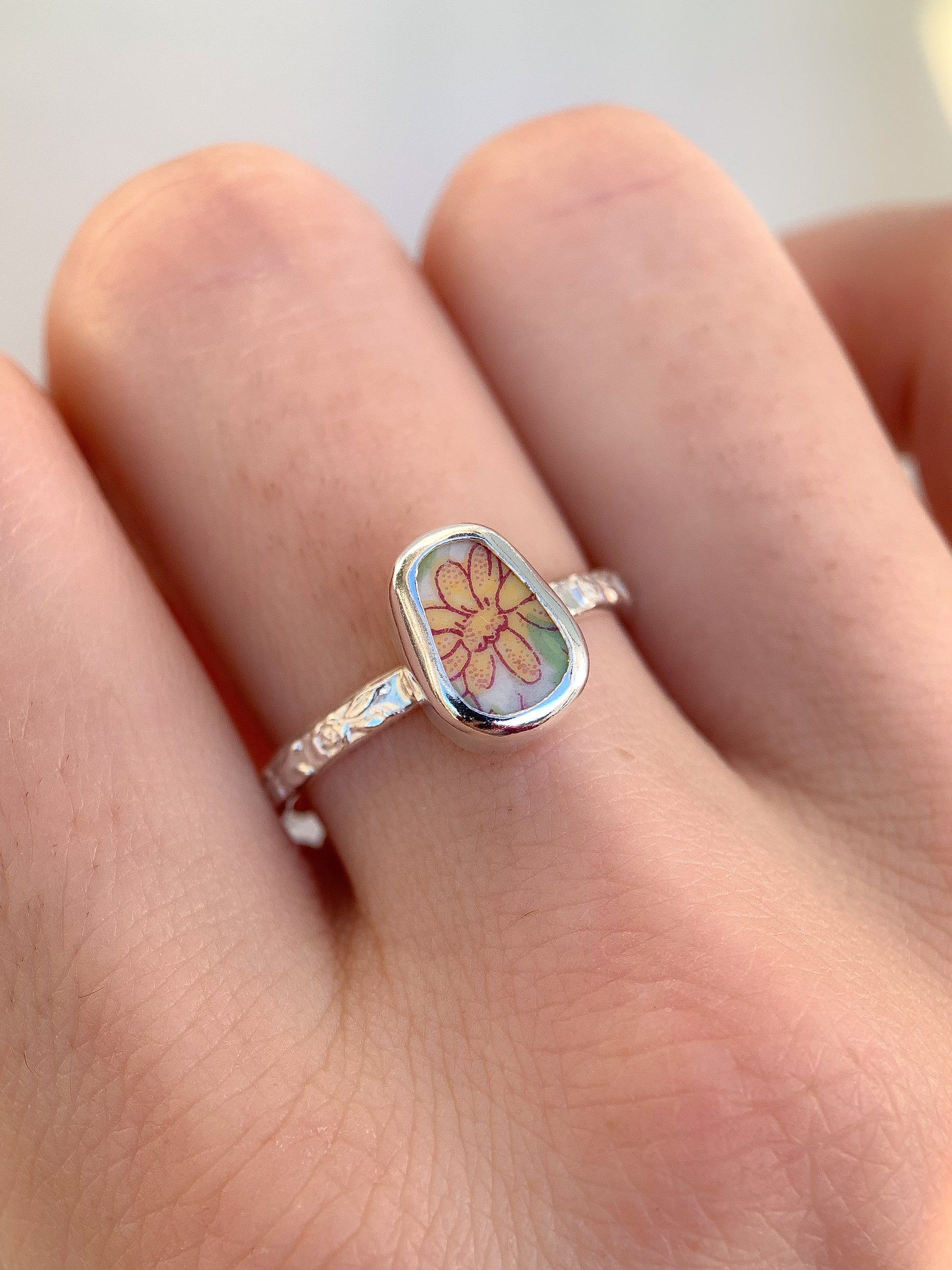 Using broken pieces of gifted & thrifted pottery, china, and ceramics, I shape each piece to a more soft and organic shape & set in a fine silver bezel on a simple sterling silver rose-patterned band.