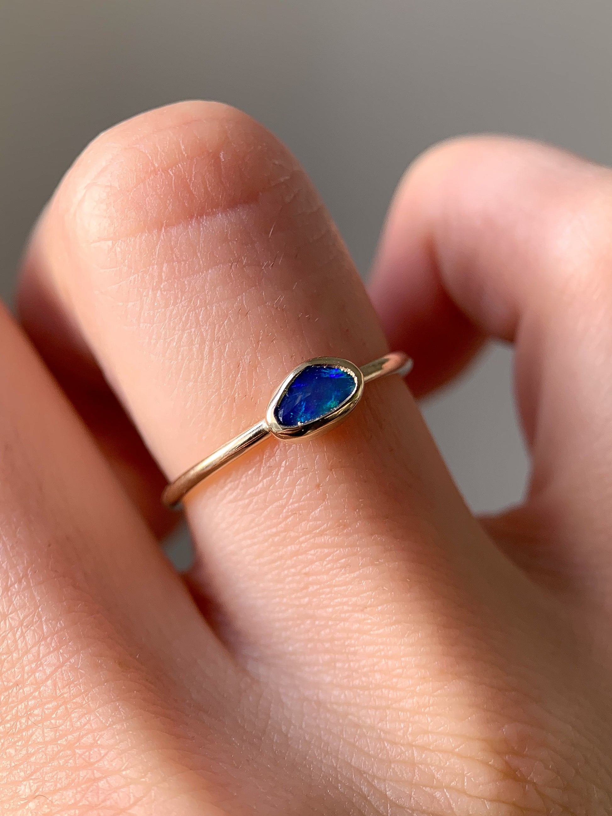 This solid Australian Opal is set in a 10K Gold bezel to reflect its’ flecks of aqua and lime.
