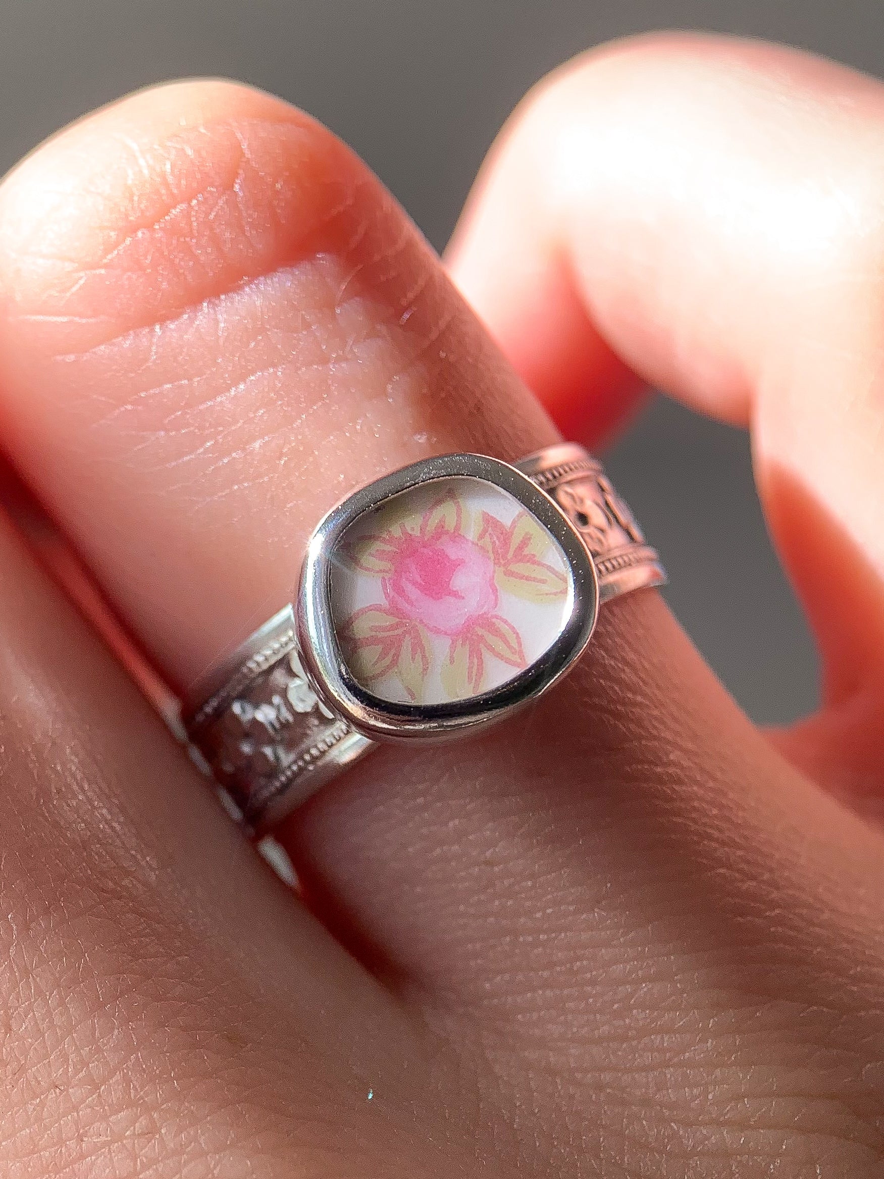 Using broken pieces of gifted & thrifted pottery, china, and ceramics, I shape each piece to a soft and organic shape & set in a fine silver bezel on a chunky, detailed sterling silver band.
