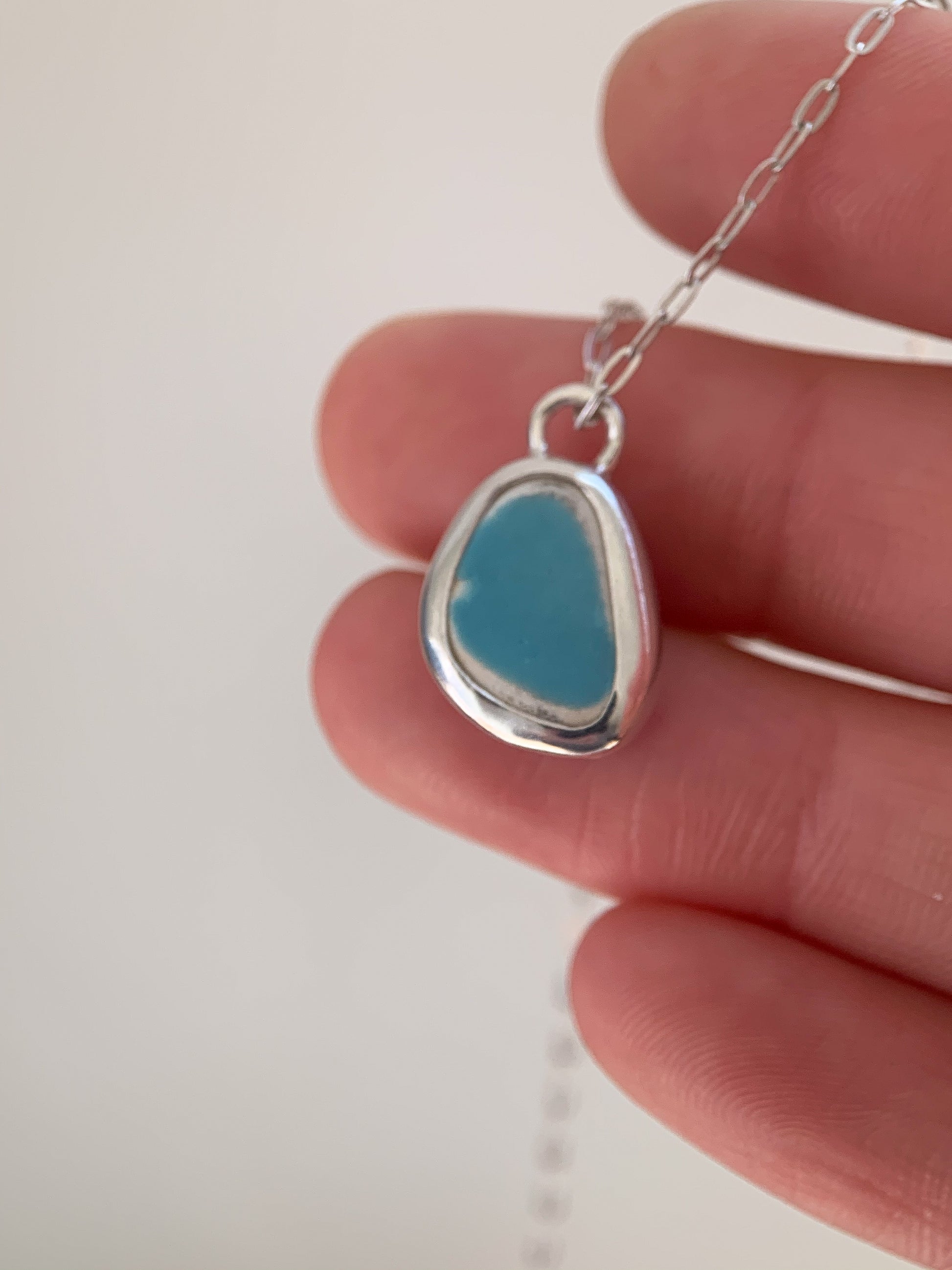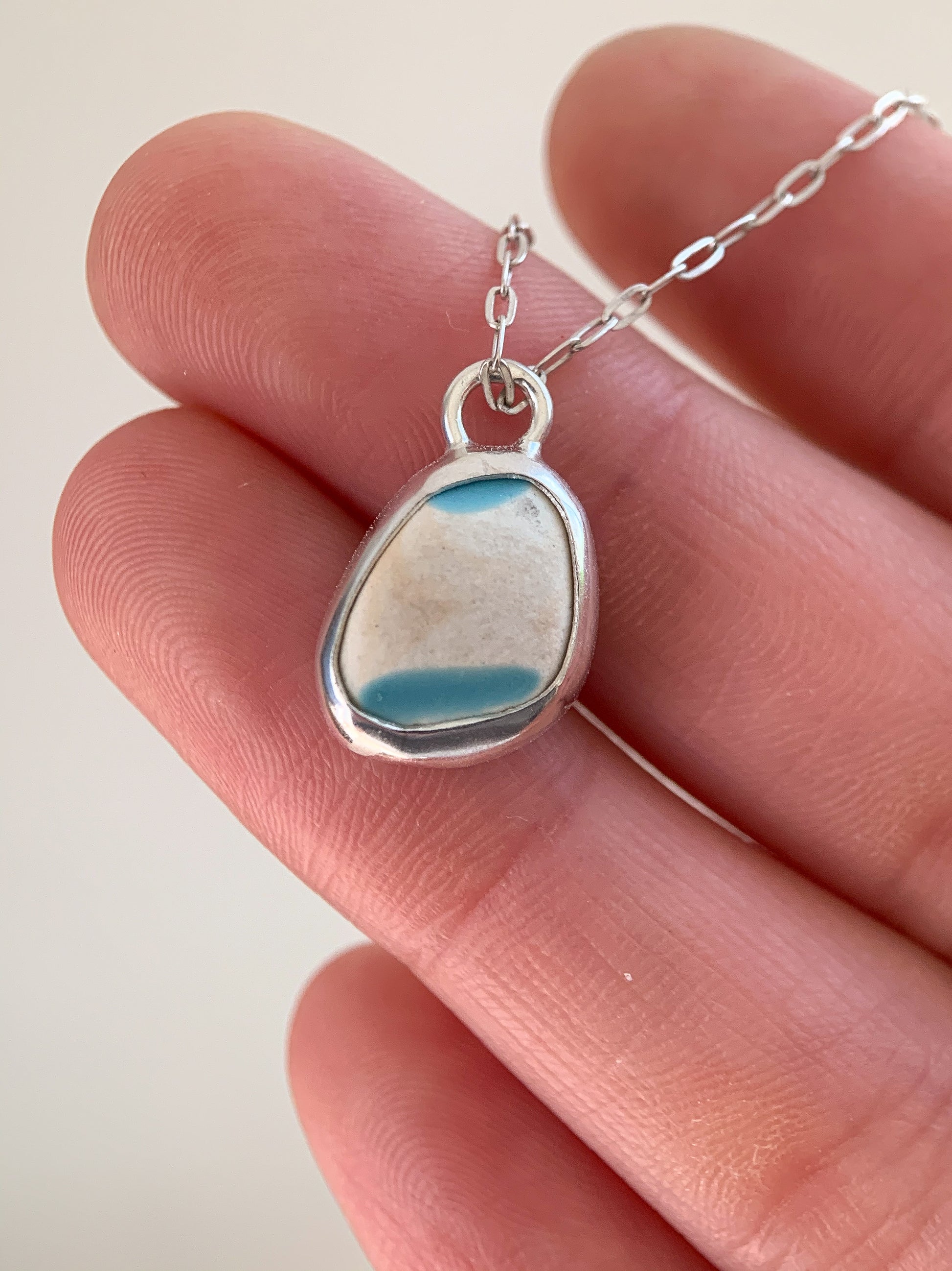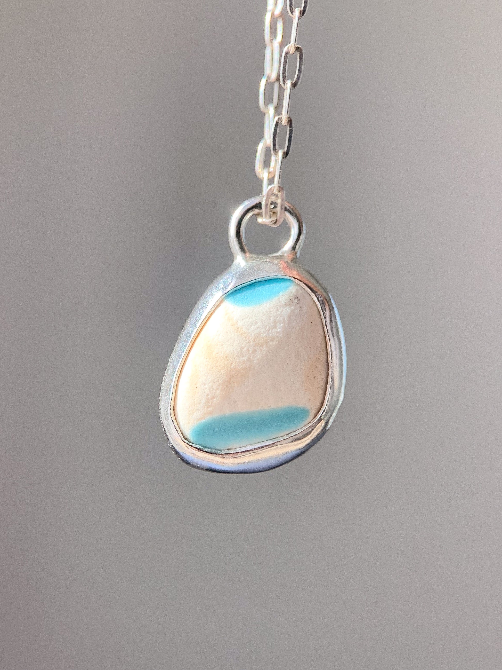 This sea pottery piece is set in a fine silver bezel with an open back to be worn on either of it’s unique sides. This sea pottery pendant comes on a 16 inch sterling silver chain!