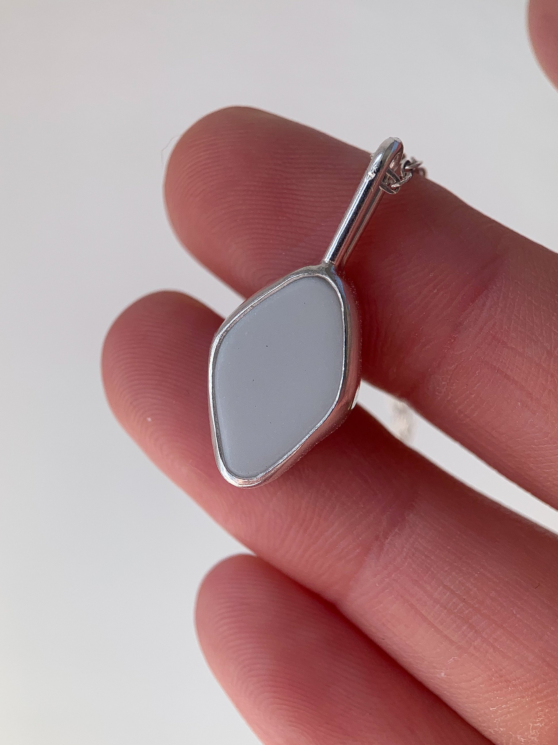 This necklace is crafted from an upcycled piece of vintage pottery, shaped into a soft, organic form and set in a fine silver open-back bezel.